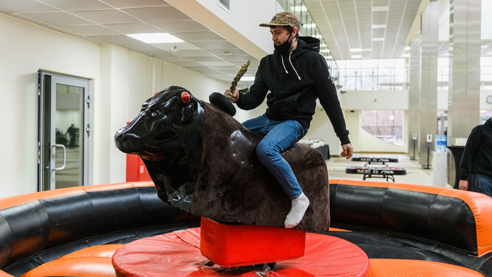 Помимо спортивной составляющей, мы обеспечивали и развлекательную часть в холле. Гости смогли проверить свой удар в Силомере груша, оседлать быка в механическом родео, покидать дротики, или сразиться друг с другом в армрестлинге.