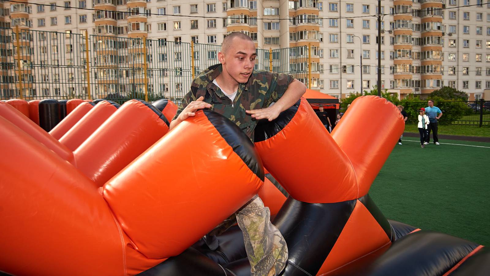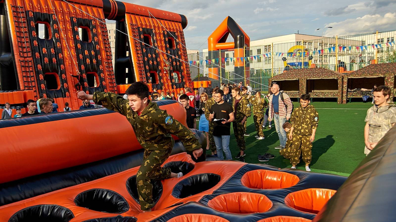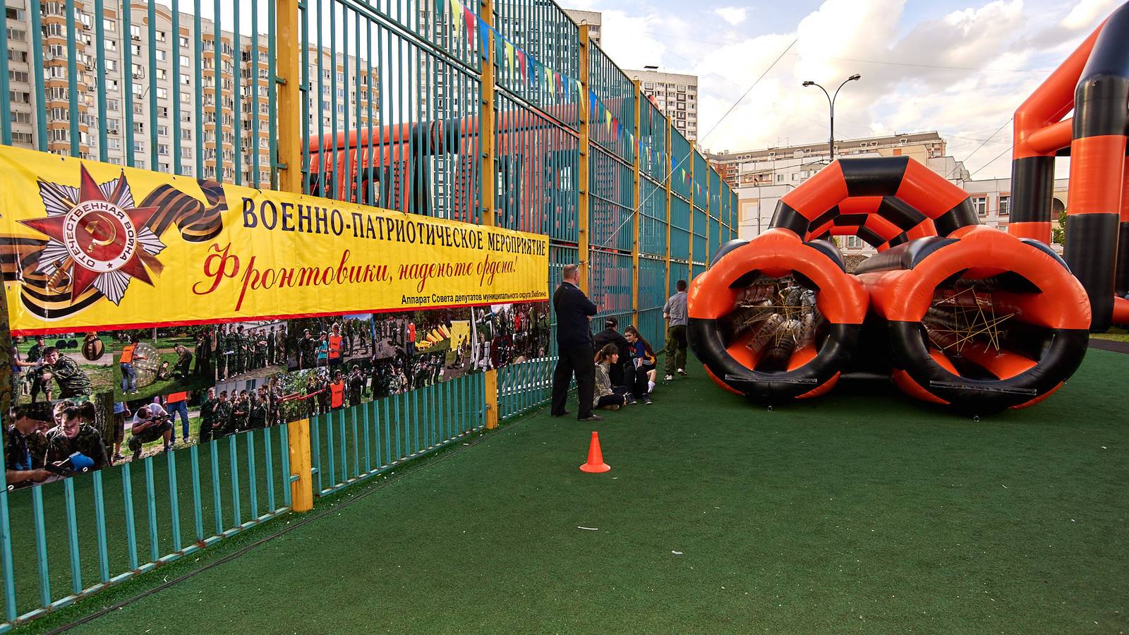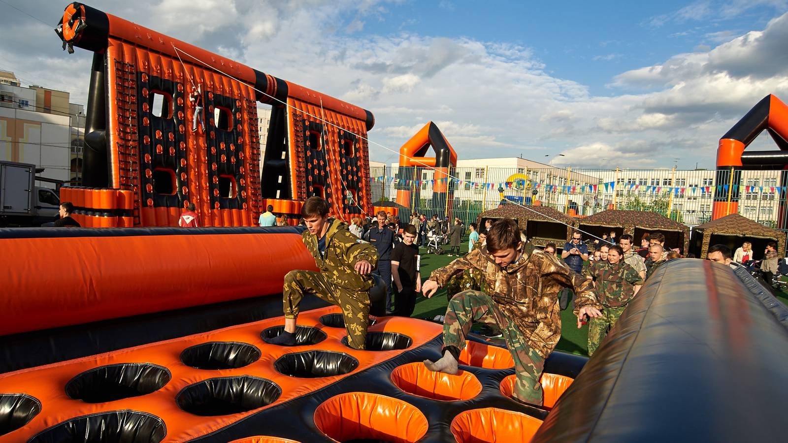 Военно-патриотические мероприятия – это именно та ниточка, которая неразрывно связывает поколения каждой семьи в нашей большой стране. Эта связь помогла организовать прекрасный спортивный праздник на дворовой площадке в одном из городов подмосковья. Надувная полоса препятствий стала главным элементом муниципальной спартакиады.