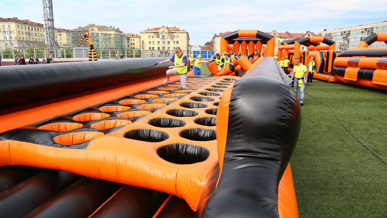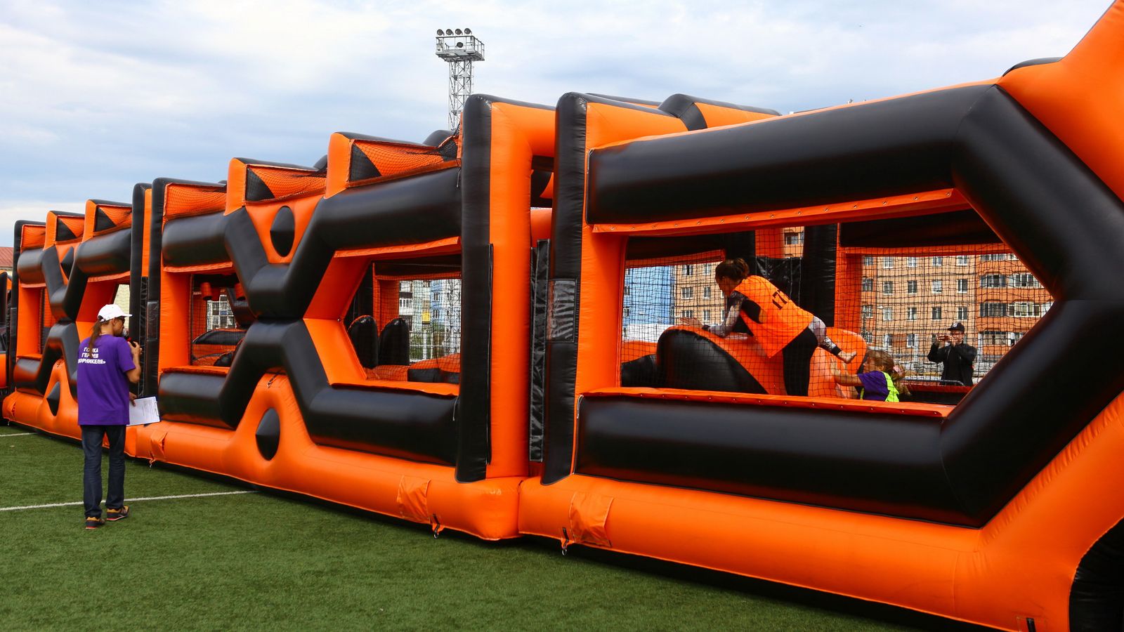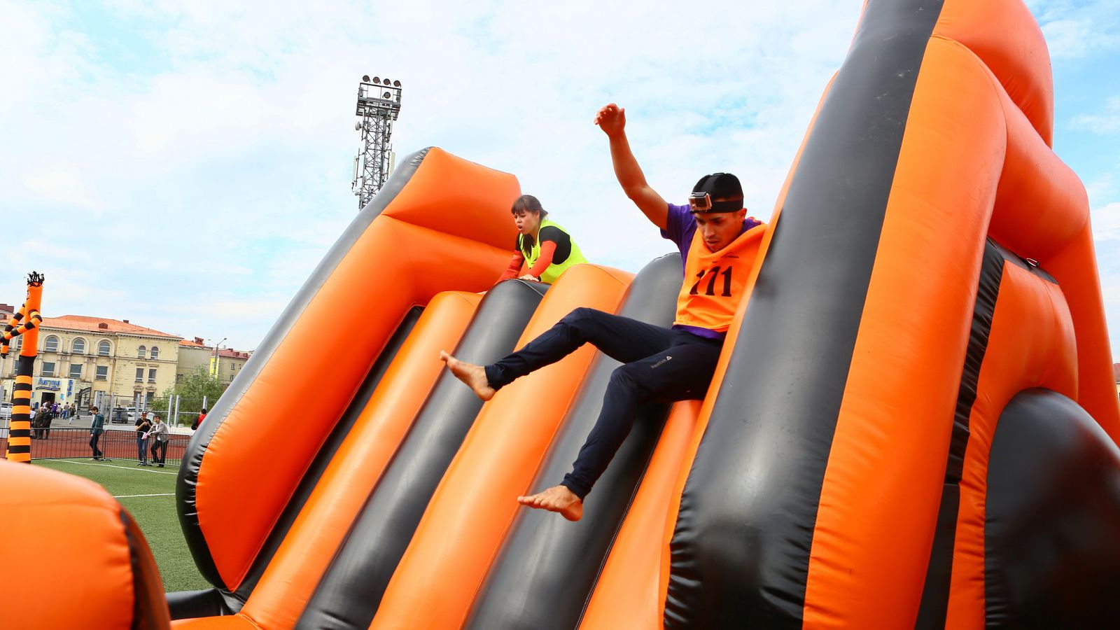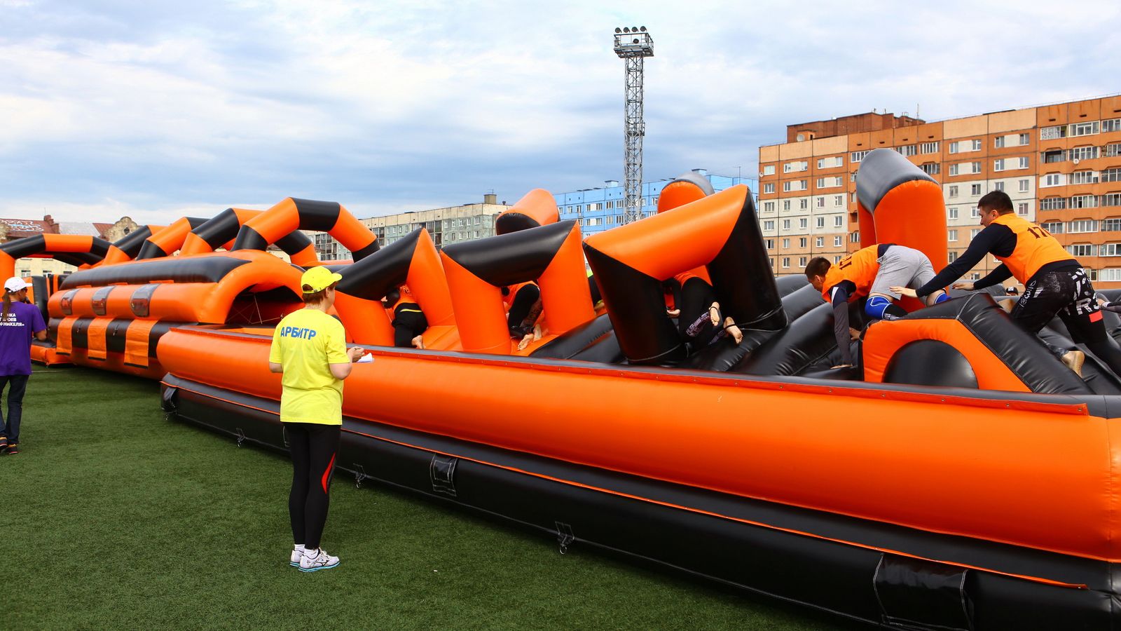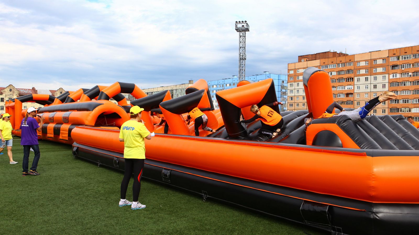 «Вызов принят» предоставили для участников спортивной гонки одну из самых протяженных и сложных надувных трасс с препятствиями. Яркая черно-оранжевая надувная конструкция батутной трассы возвышалась над искусственным газоном городского стадиона и уже заранее среди финалистов слышались восторженные возгласы.