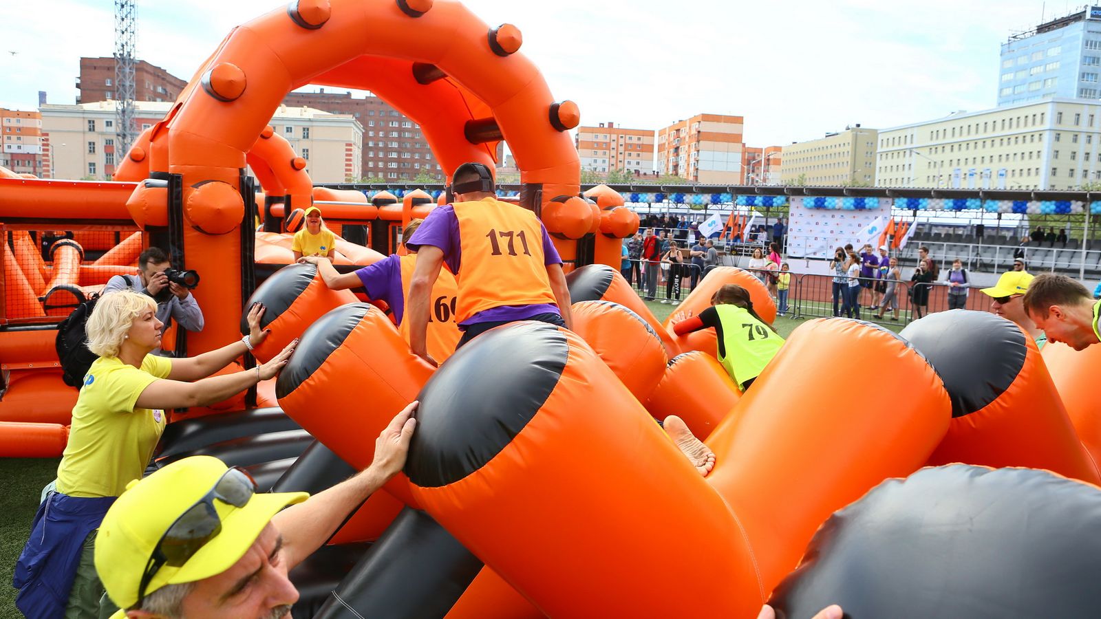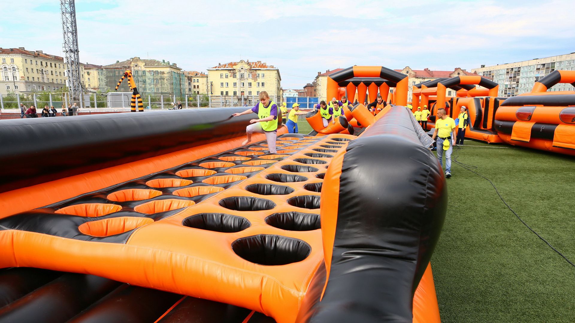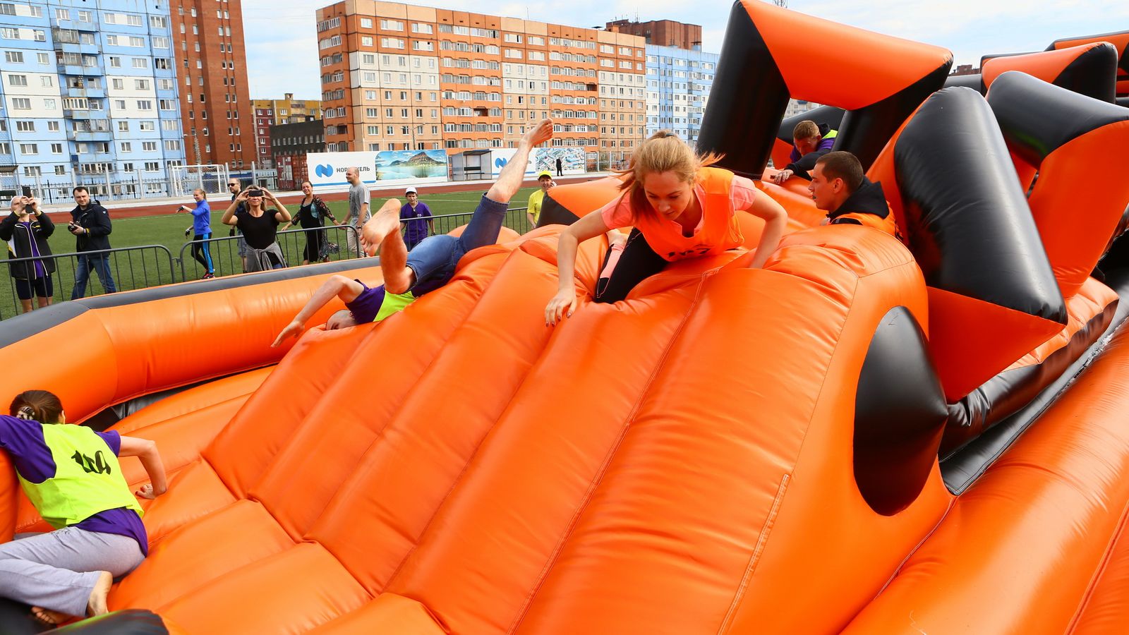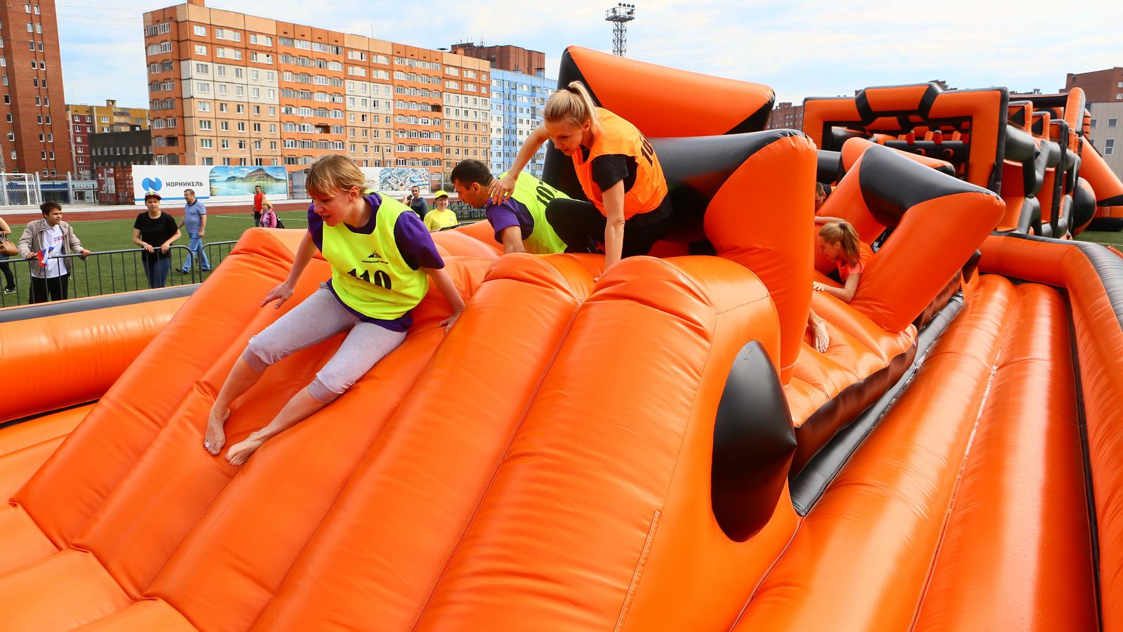 «Вызов принят» предоставили для участников спортивной гонки одну из самых протяженных и сложных надувных трасс с препятствиями. Яркая черно-оранжевая надувная конструкция батутной трассы возвышалась над искусственным газоном городского стадиона и уже заранее среди финалистов слышались восторженные возгласы.