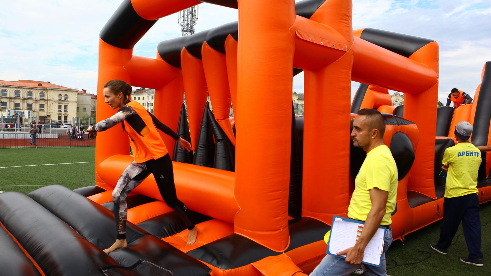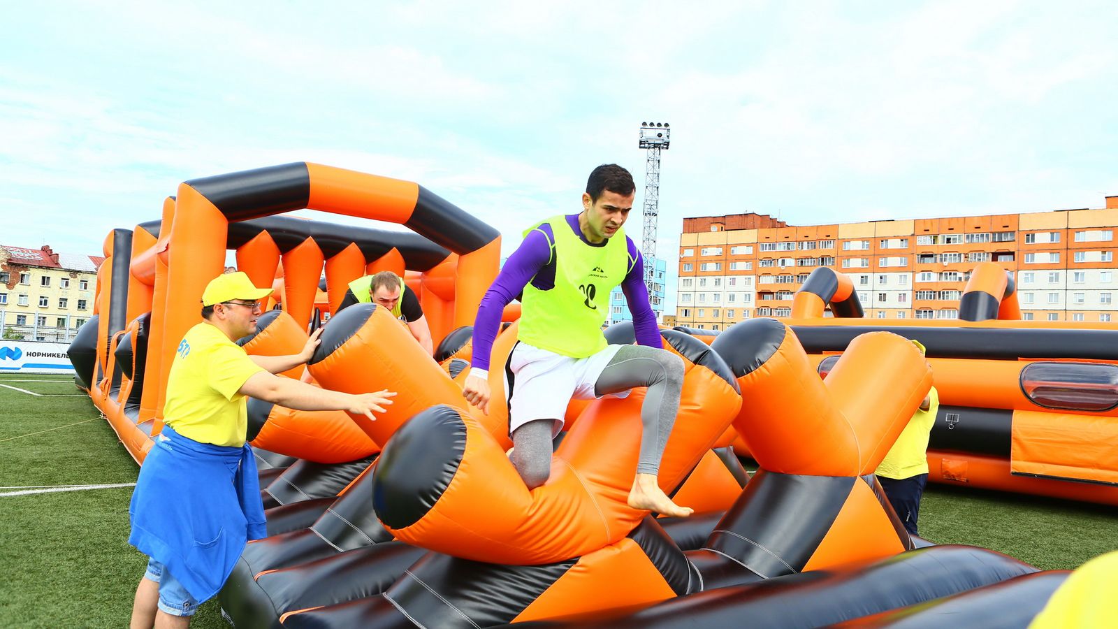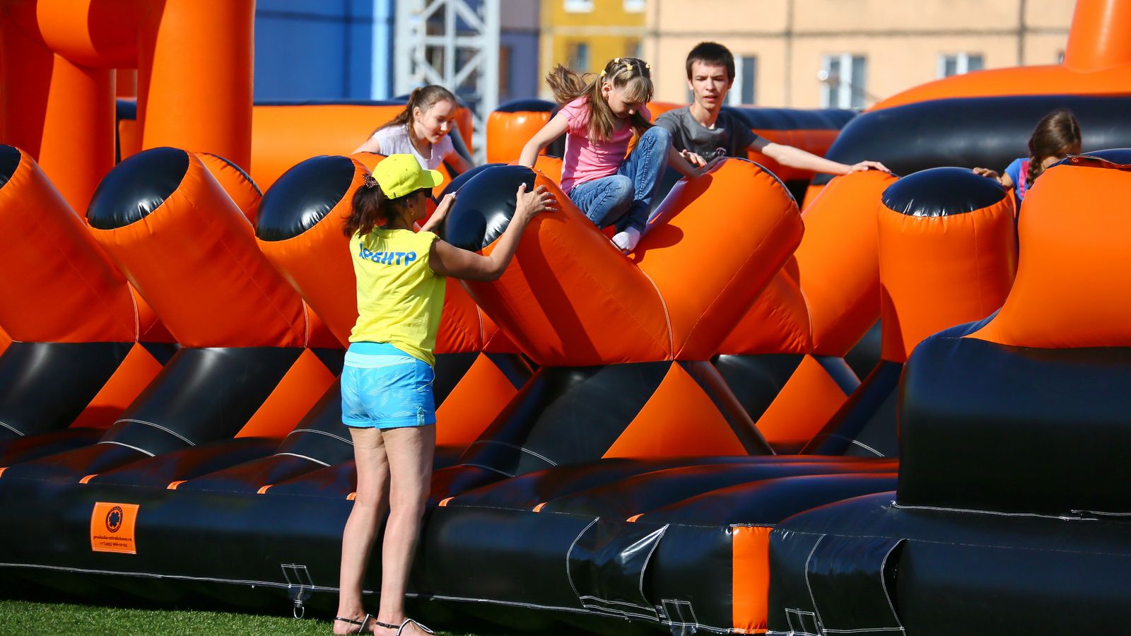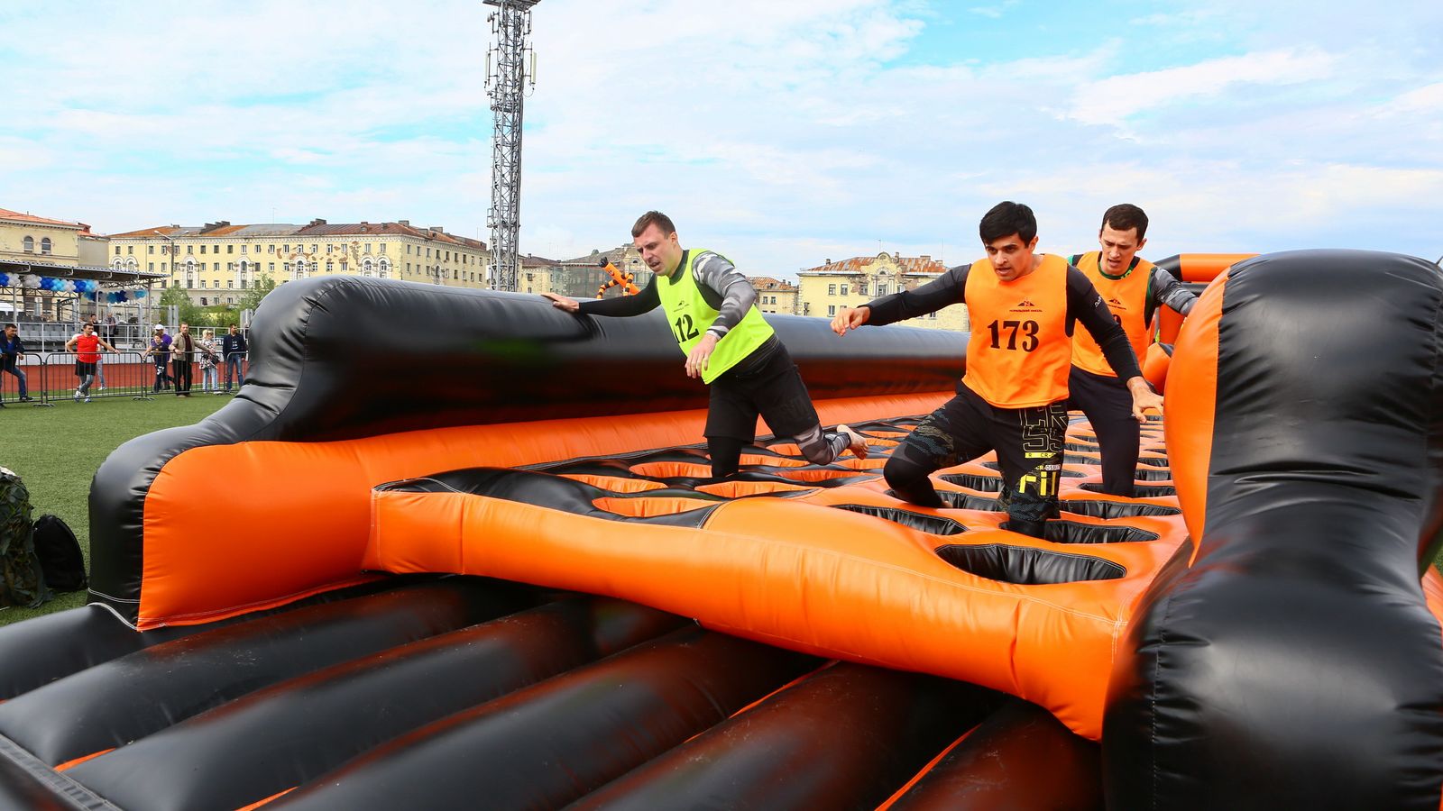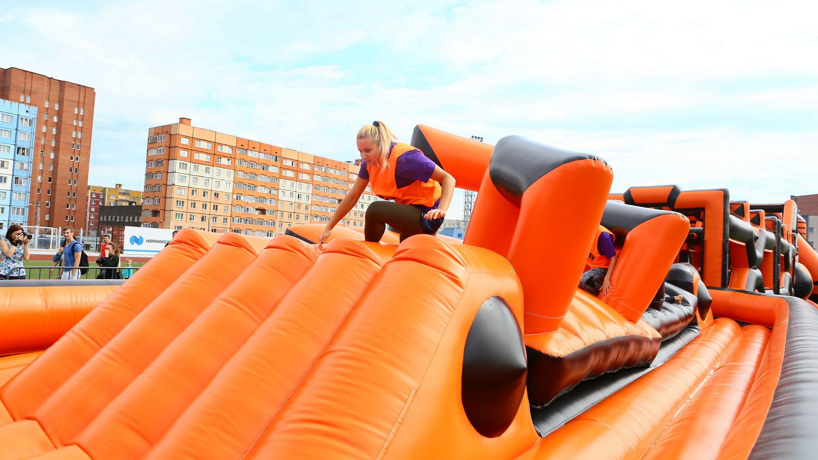 «Вызов принят» предоставили для участников спортивной гонки одну из самых протяженных и сложных надувных трасс с препятствиями. Яркая черно-оранжевая надувная конструкция батутной трассы возвышалась над искусственным газоном городского стадиона и уже заранее среди финалистов слышались восторженные возгласы.