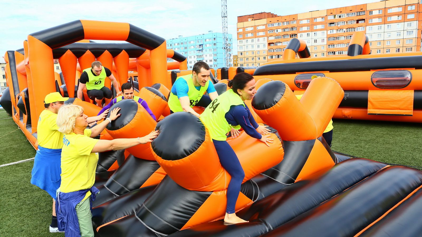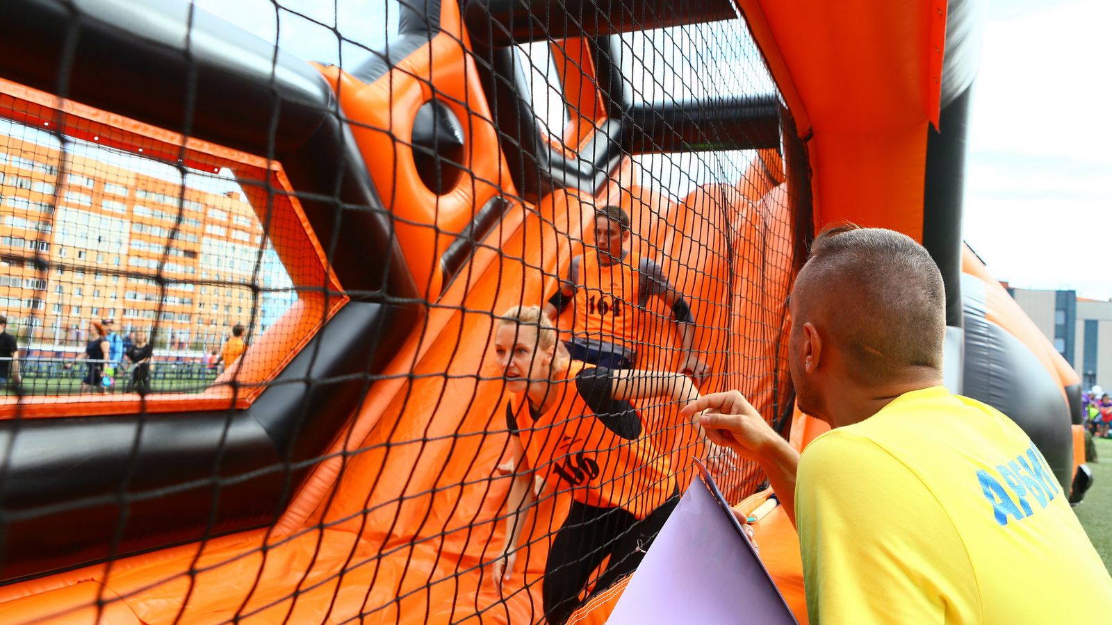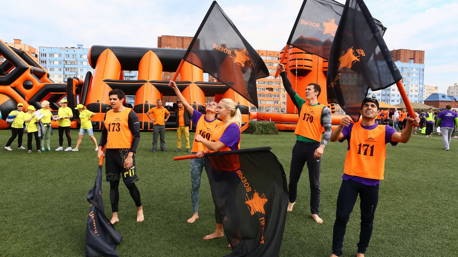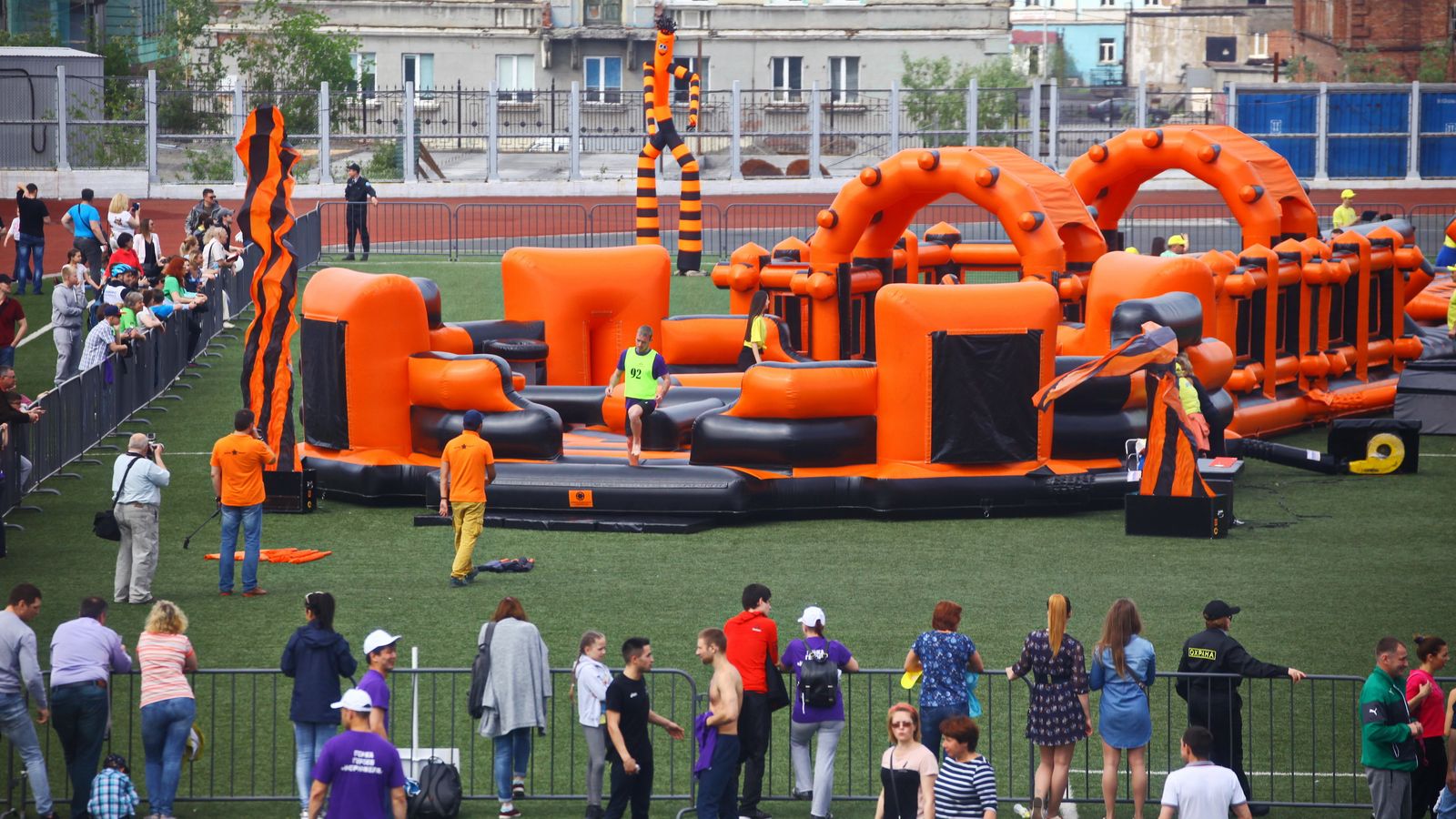 «Вызов принят» предоставили для участников спортивной гонки одну из самых протяженных и сложных надувных трасс с препятствиями. Яркая черно-оранжевая надувная конструкция батутной трассы возвышалась над искусственным газоном городского стадиона и уже заранее среди финалистов слышались восторженные возгласы.