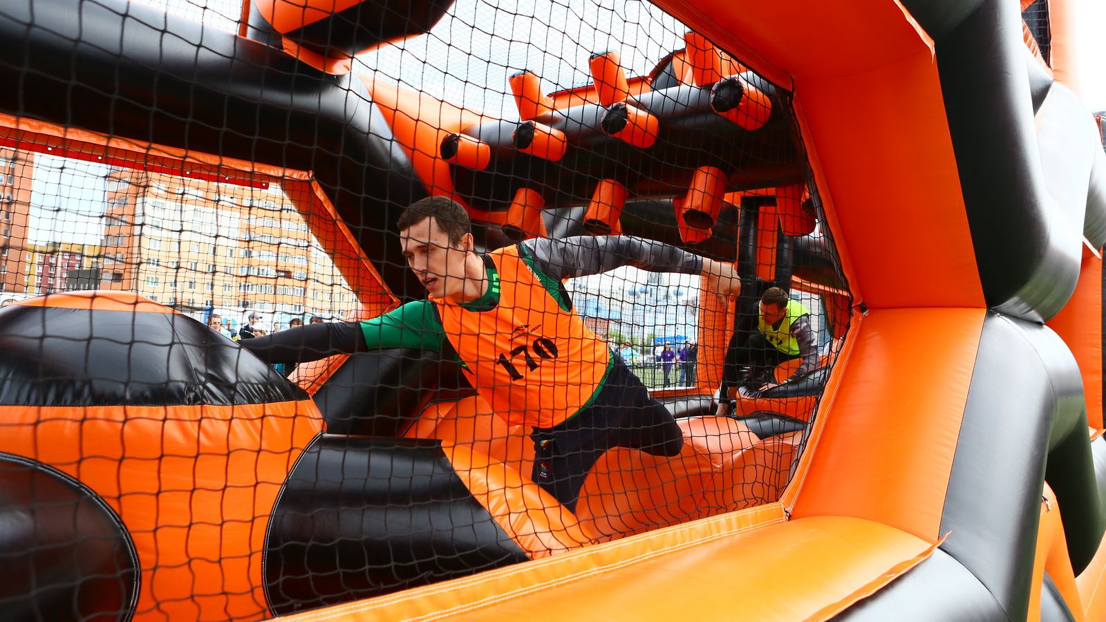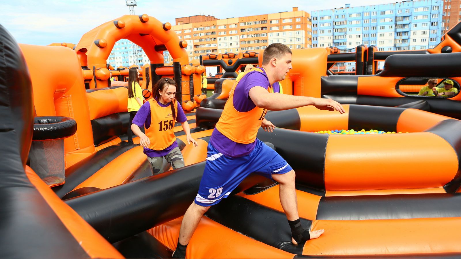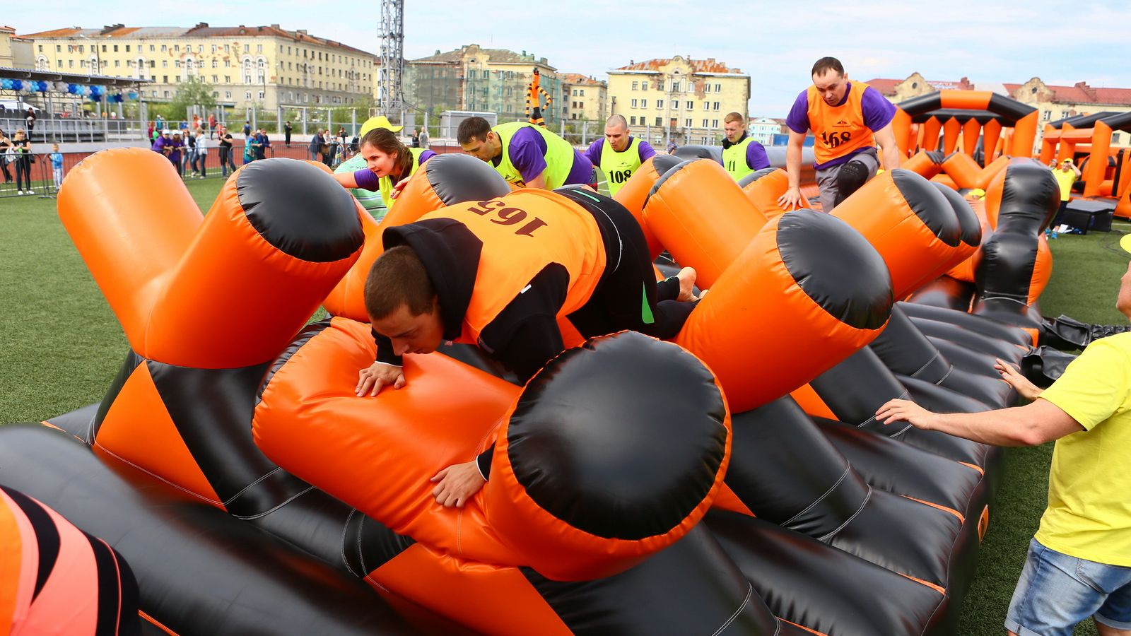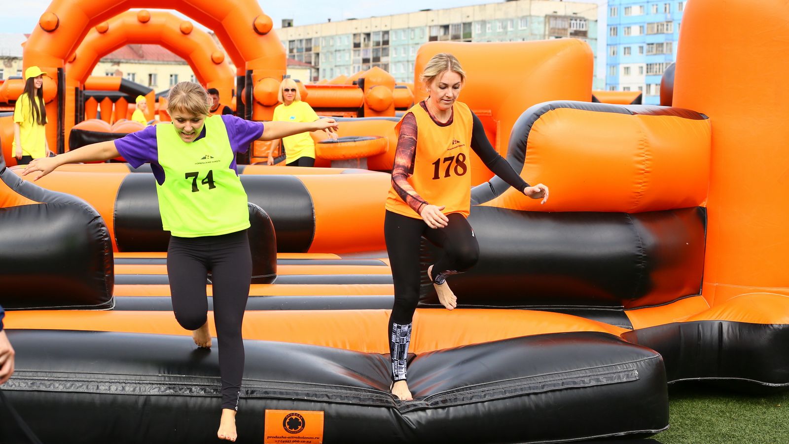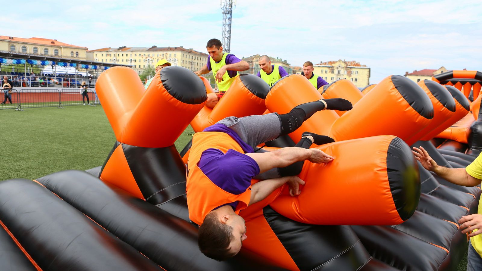 «Вызов принят» предоставили для участников спортивной гонки одну из самых протяженных и сложных надувных трасс с препятствиями. Яркая черно-оранжевая надувная конструкция батутной трассы возвышалась над искусственным газоном городского стадиона и уже заранее среди финалистов слышались восторженные возгласы.