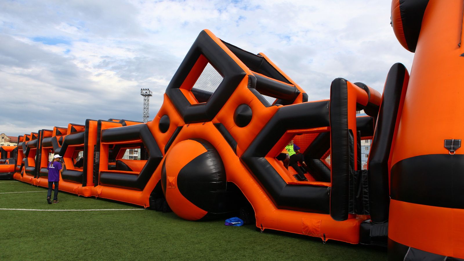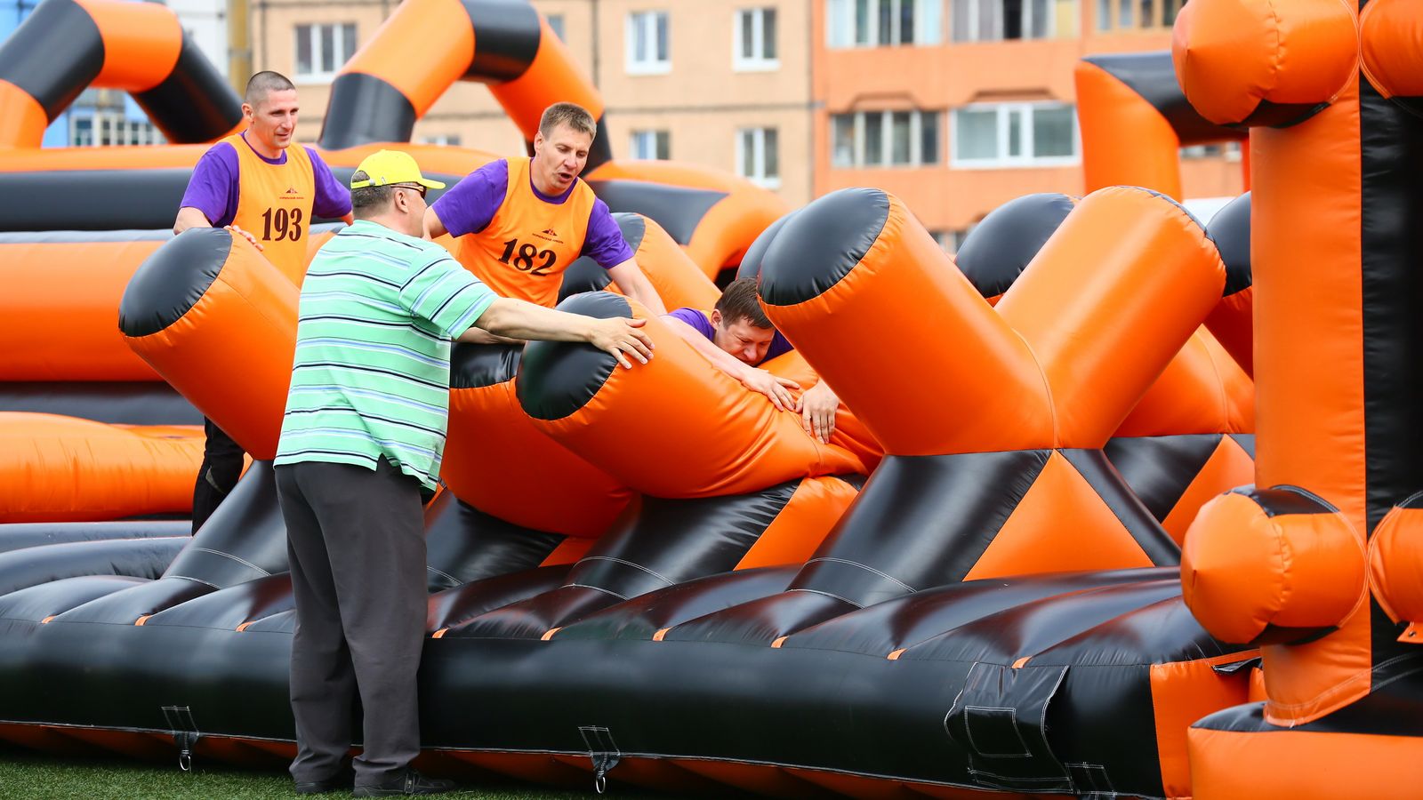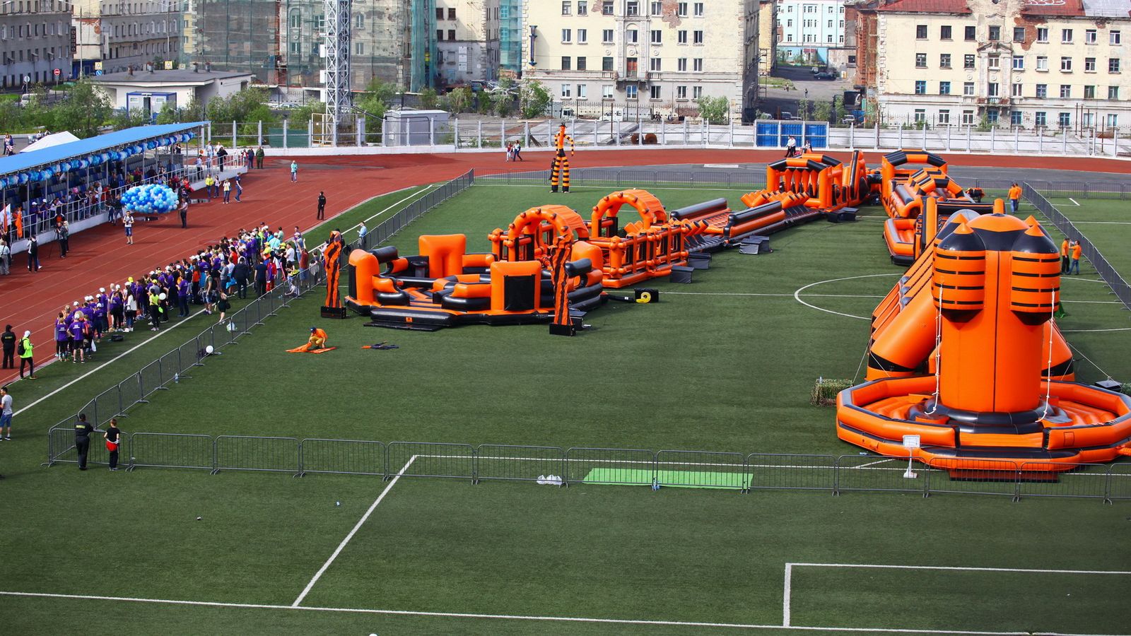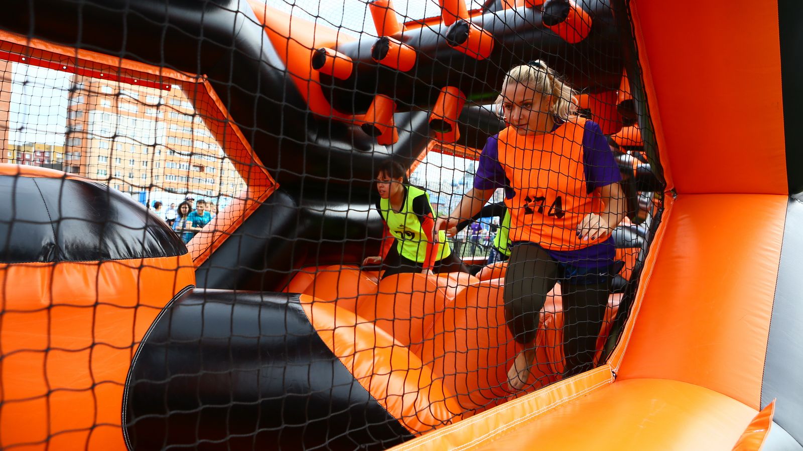 «Вызов принят» предоставили для участников спортивной гонки одну из самых протяженных и сложных надувных трасс с препятствиями. Яркая черно-оранжевая надувная конструкция батутной трассы возвышалась над искусственным газоном городского стадиона и уже заранее среди финалистов слышались восторженные возгласы.