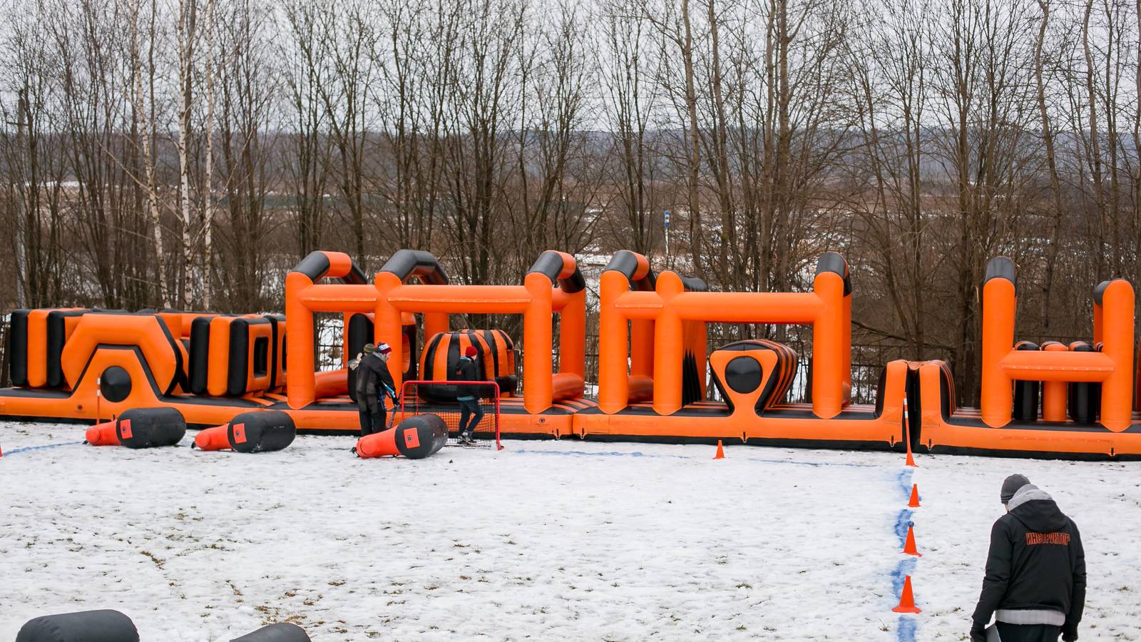 Эффектное патриотичное оформление надувных элементов в цветах георгиевской ленты особенно выигрышно смотрится зимой на фоне белого снега. Атмосферу праздника дополняет аэромен и имитация огня из развевающейся в потоке воздуха черно-оранжевой ленты. Согреться и восполнить затраченные на прохождение испытаний килокалории участники спешили в зоне кейтеринга.