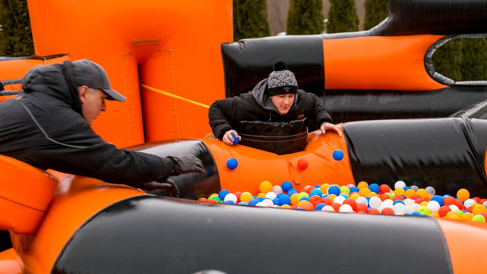 Это отлично иллюстрирует простоту и доступность прохождения батутной трассы с препятствиями для участников любого возраста. Надувная трасса дополняется отдельными станциями, где участники соревнуются в меткости, сражаются с использованием надувных бит, собирают объемные головоломки или принимают участие в забавном батутном родео.