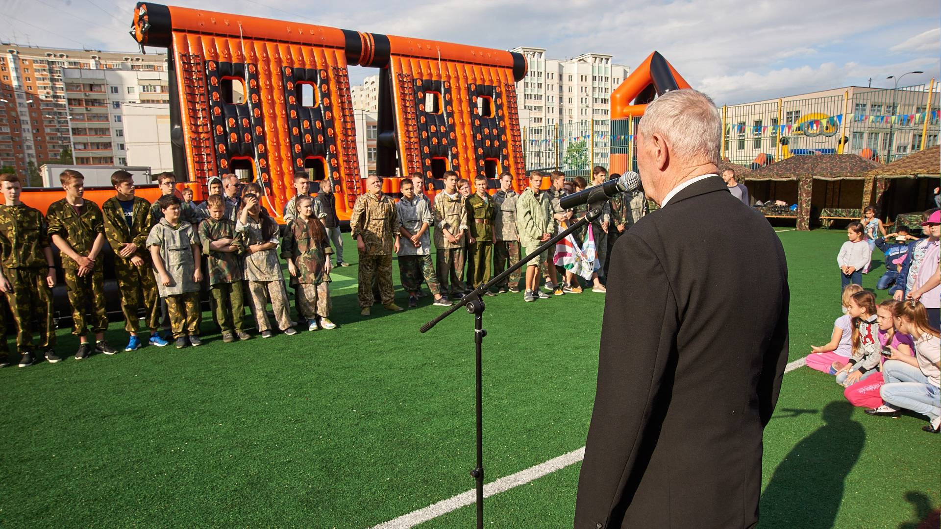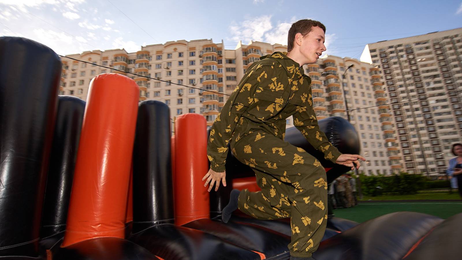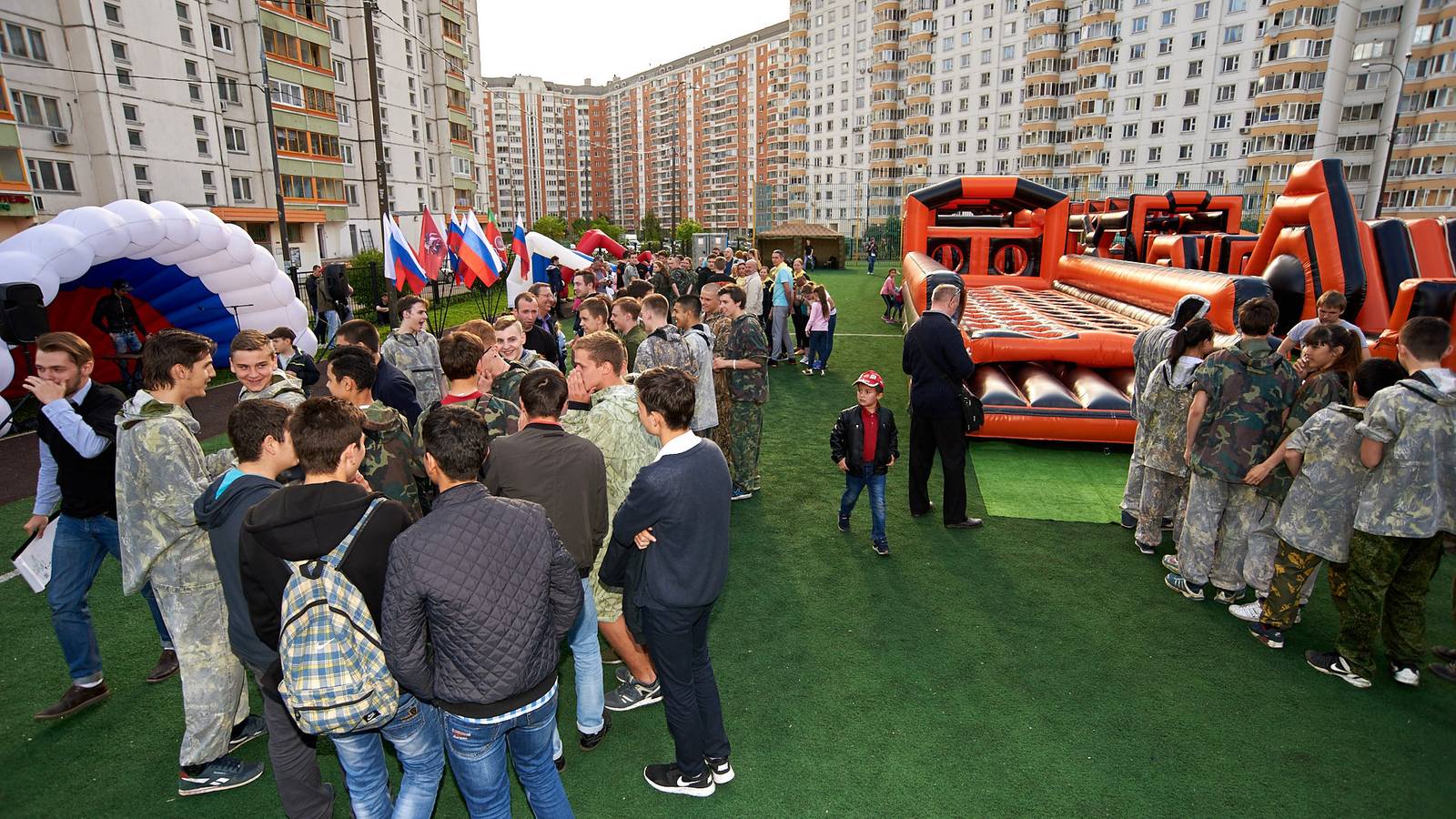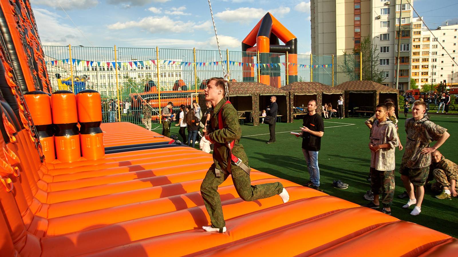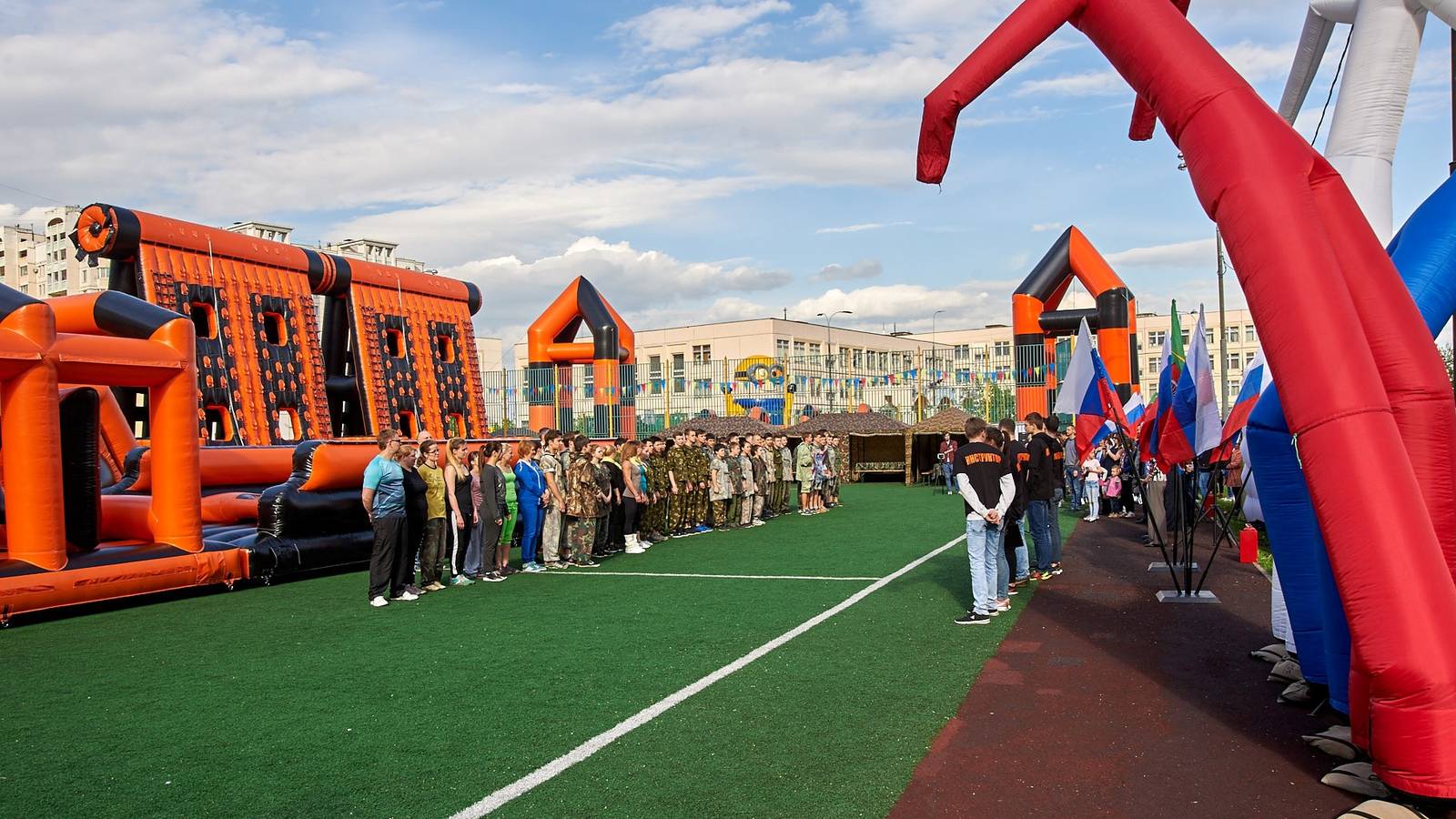 Военно-патриотические мероприятия – это именно та ниточка, которая неразрывно связывает поколения каждой семьи в нашей большой стране. Эта связь помогла организовать прекрасный спортивный праздник на дворовой площадке в одном из городов подмосковья. Надувная полоса препятствий стала главным элементом муниципальной спартакиады.