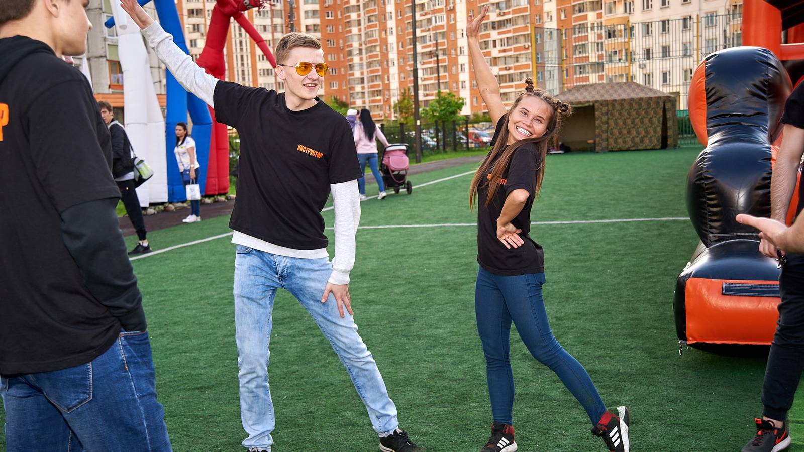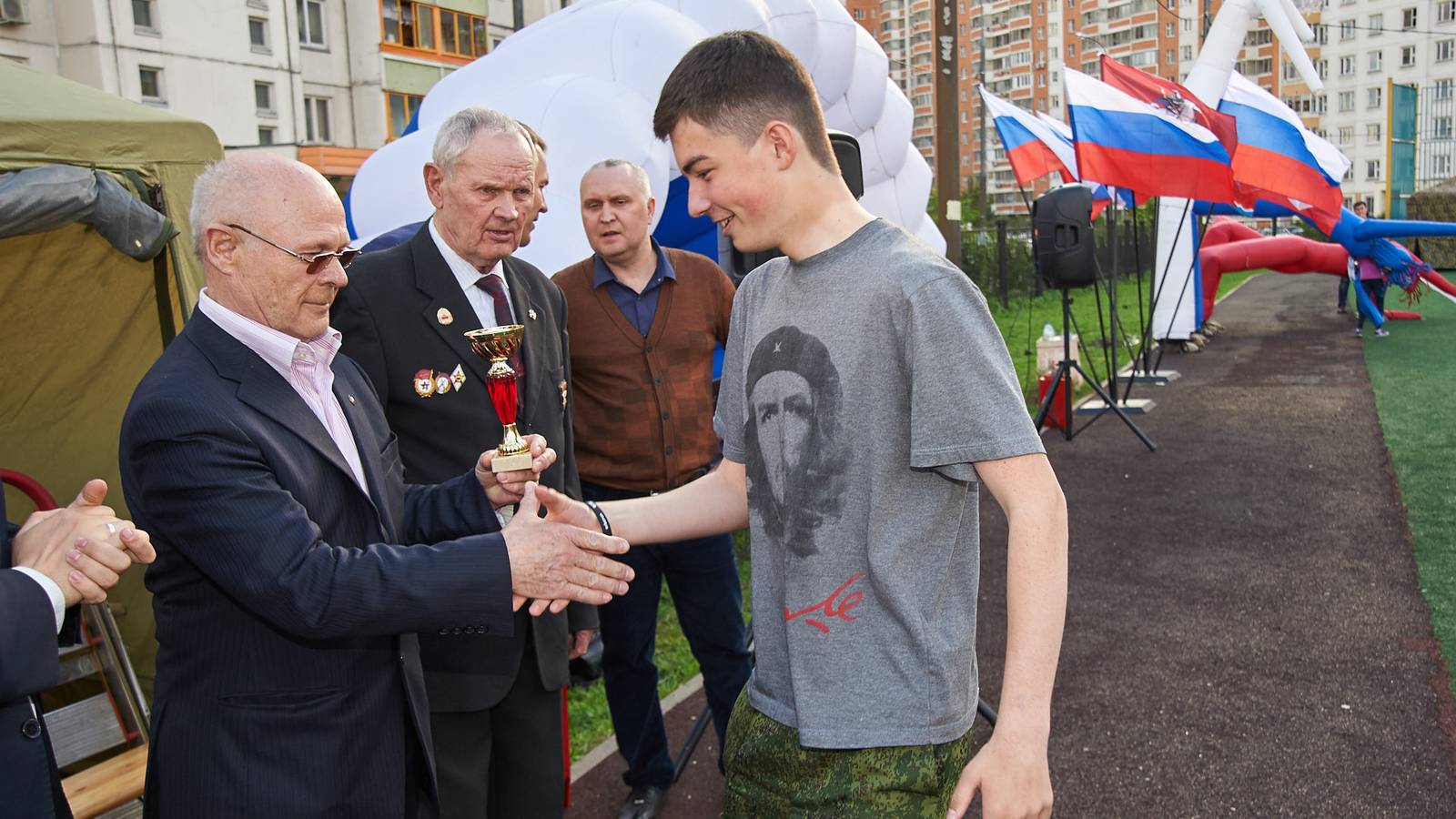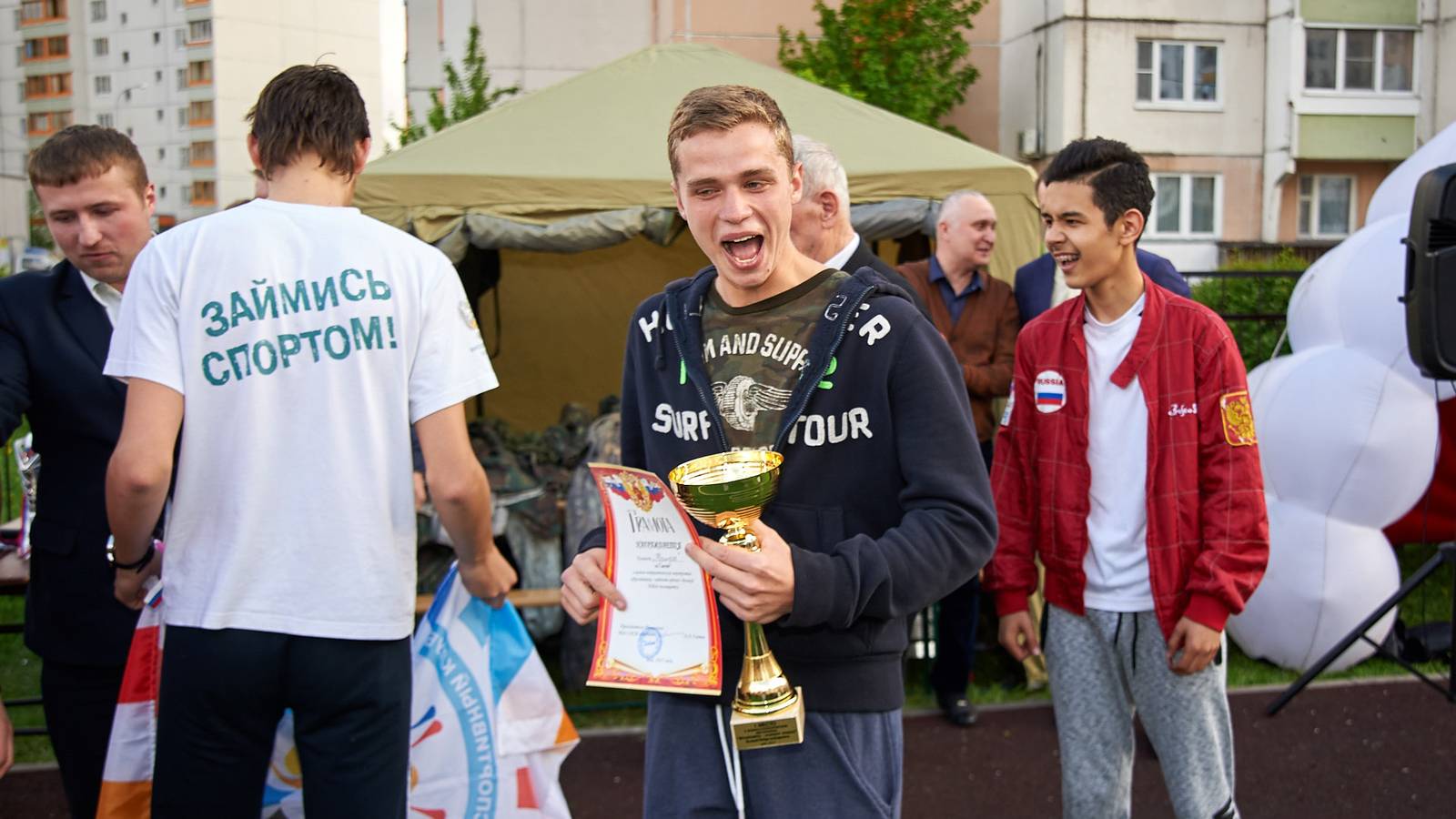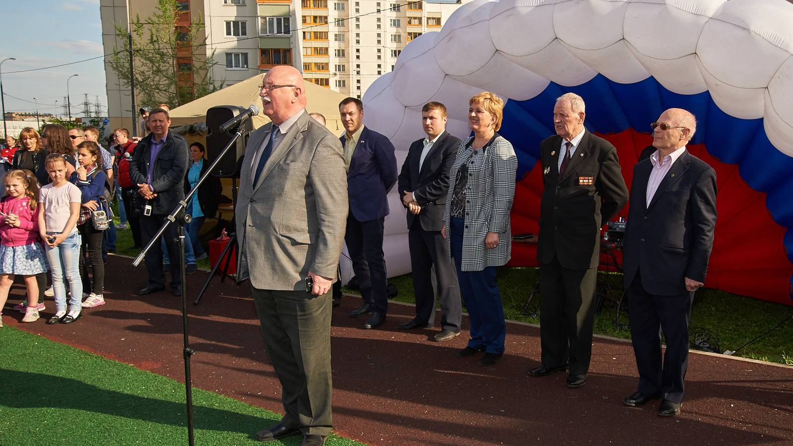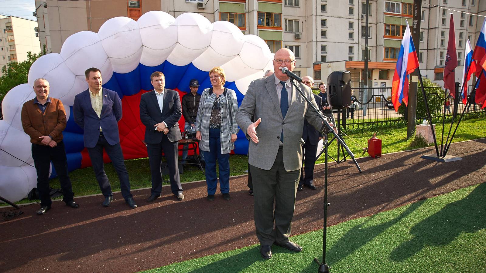 Вступительное слово о важности Родины и защиты Отечества выступили муниципальные депутаты и представители ветеранской организации. От участников не требовалось никакой предварительной подготовки, поэтому за ходом состязаний было интересно наблюдать и зрителям. Для малышей, присутствующих на площадке стало особенным удовольствием присоединиться с зажигательными танцами аэроменов в цветах российского флага. Праздничную площадку украшали напольные флагштоки с триколорами и эффектные композиции из надувных шаров.
