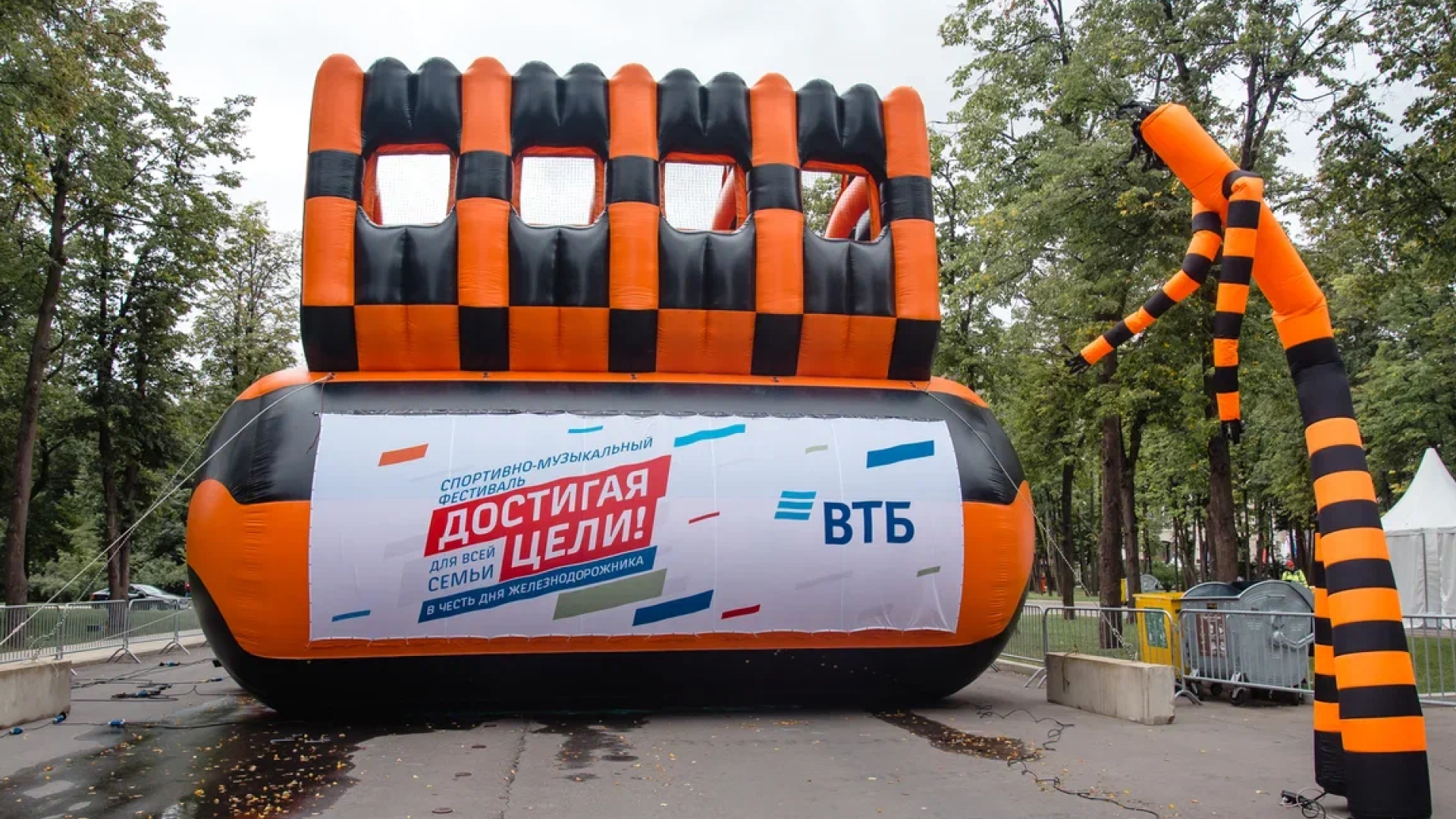 Большое количество участников собрала эффектная промо акция ко дню железнодорожника, проведенная совместно РЖД и ВТБ. Центром спортивных соревнований стала уникальная трасса из надувных элементов от “Вызов принят”, выполненная в виде поезда.