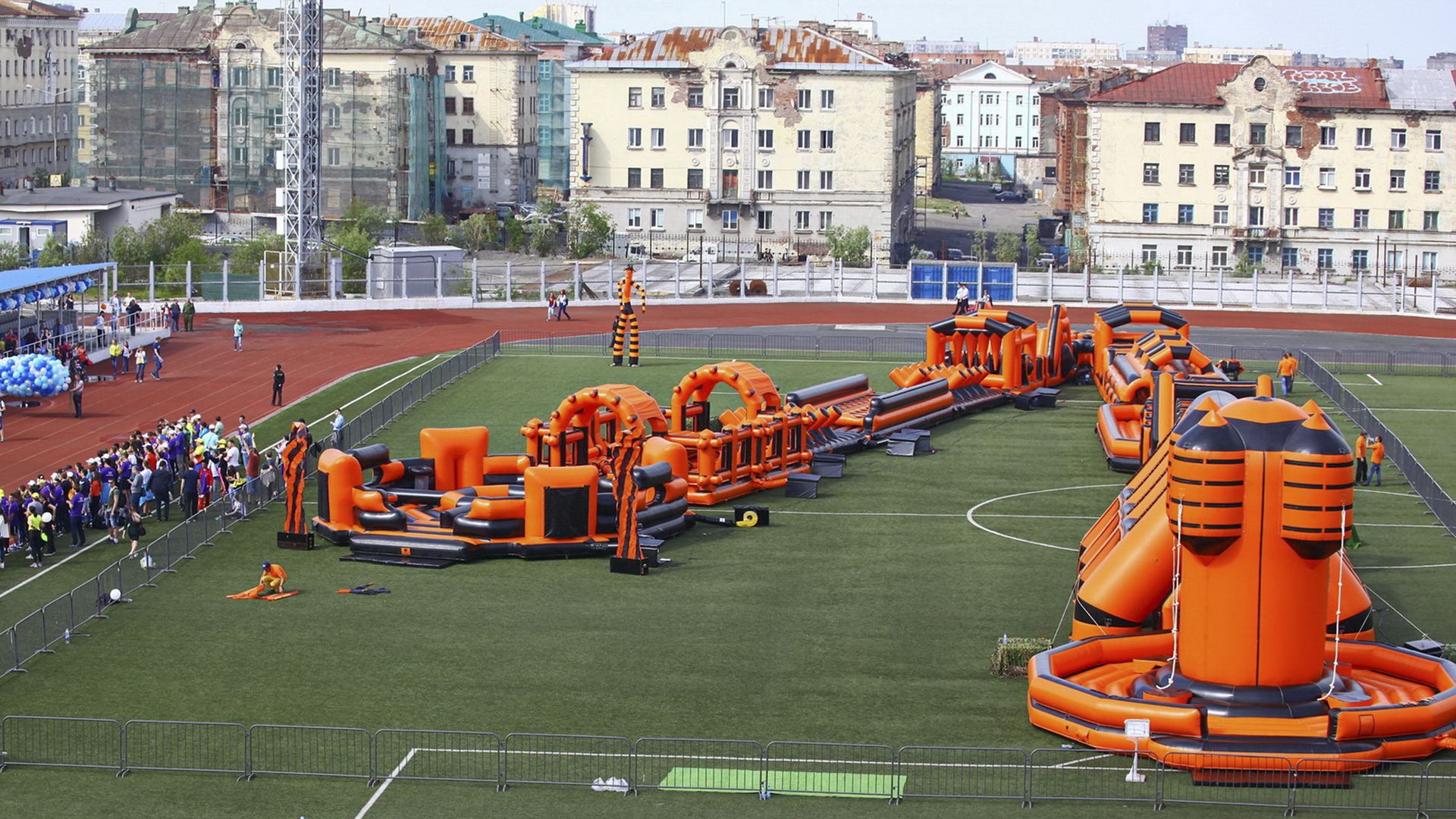 «Вызов принят» предоставили для участников спортивной гонки одну из самых протяженных и сложных надувных трасс с препятствиями. Яркая черно-оранжевая надувная конструкция батутной трассы возвышалась над искусственным газоном городского стадиона и уже заранее среди финалистов слышались восторженные возгласы.