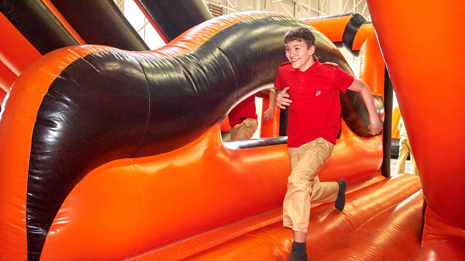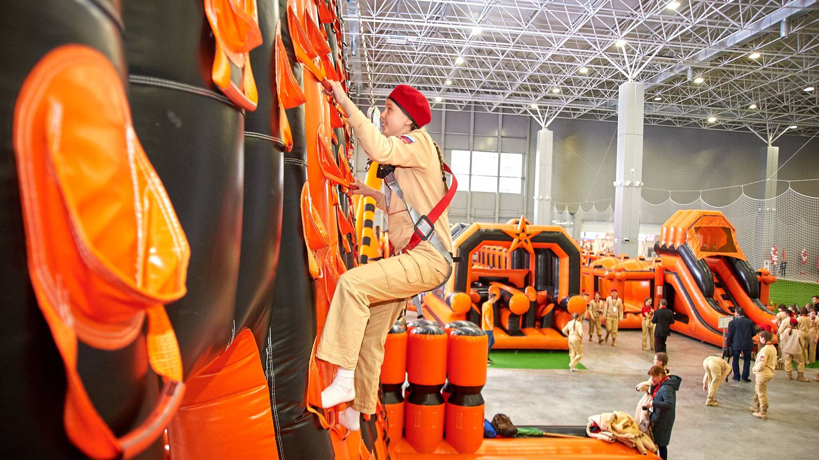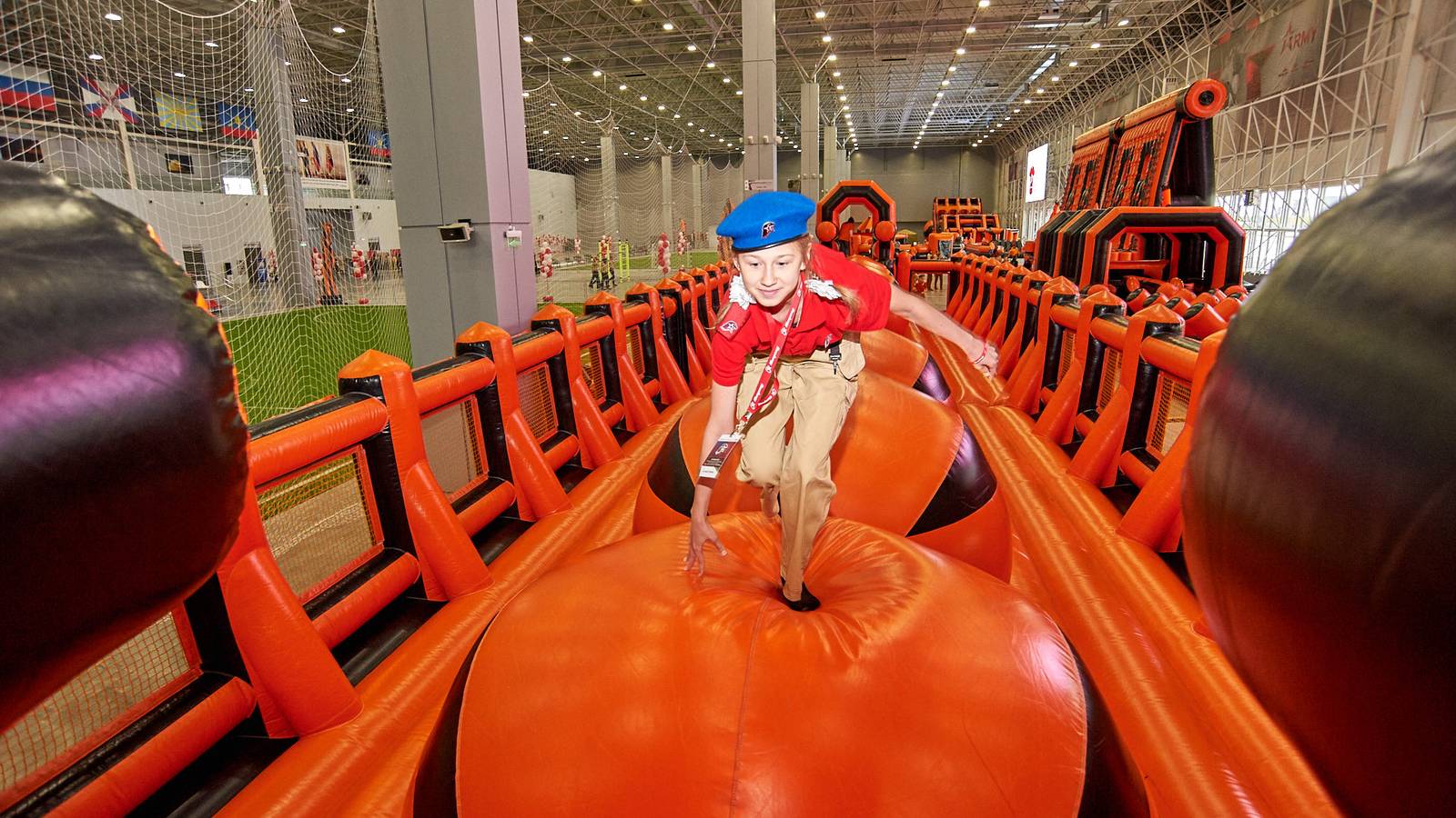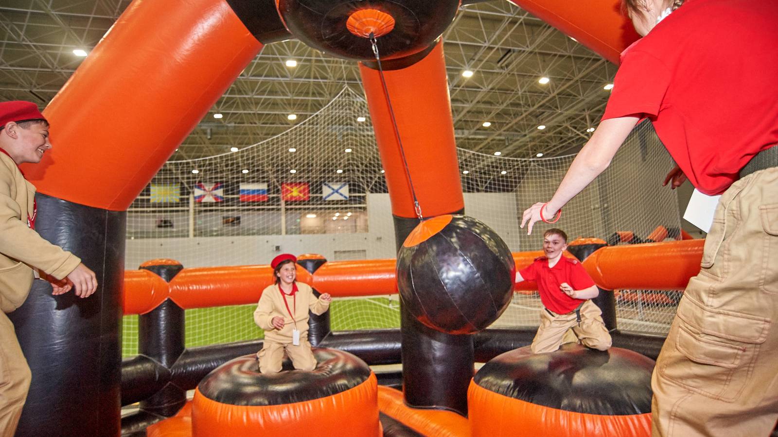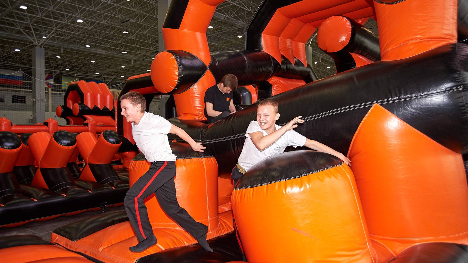 Комбинированная трасса понравилась всем, ведь здесь можно было вдоволь прыгать, забираться на горки и спускаться с них, лавировать между надувными столбами, забираться по канату и даже проехать быстрее соперника заданное расстояние на велотренажере.