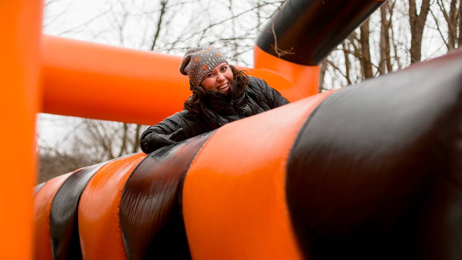 Это отлично иллюстрирует простоту и доступность прохождения батутной трассы с препятствиями для участников любого возраста. Надувная трасса дополняется отдельными станциями, где участники соревнуются в меткости, сражаются с использованием надувных бит, собирают объемные головоломки или принимают участие в забавном батутном родео.