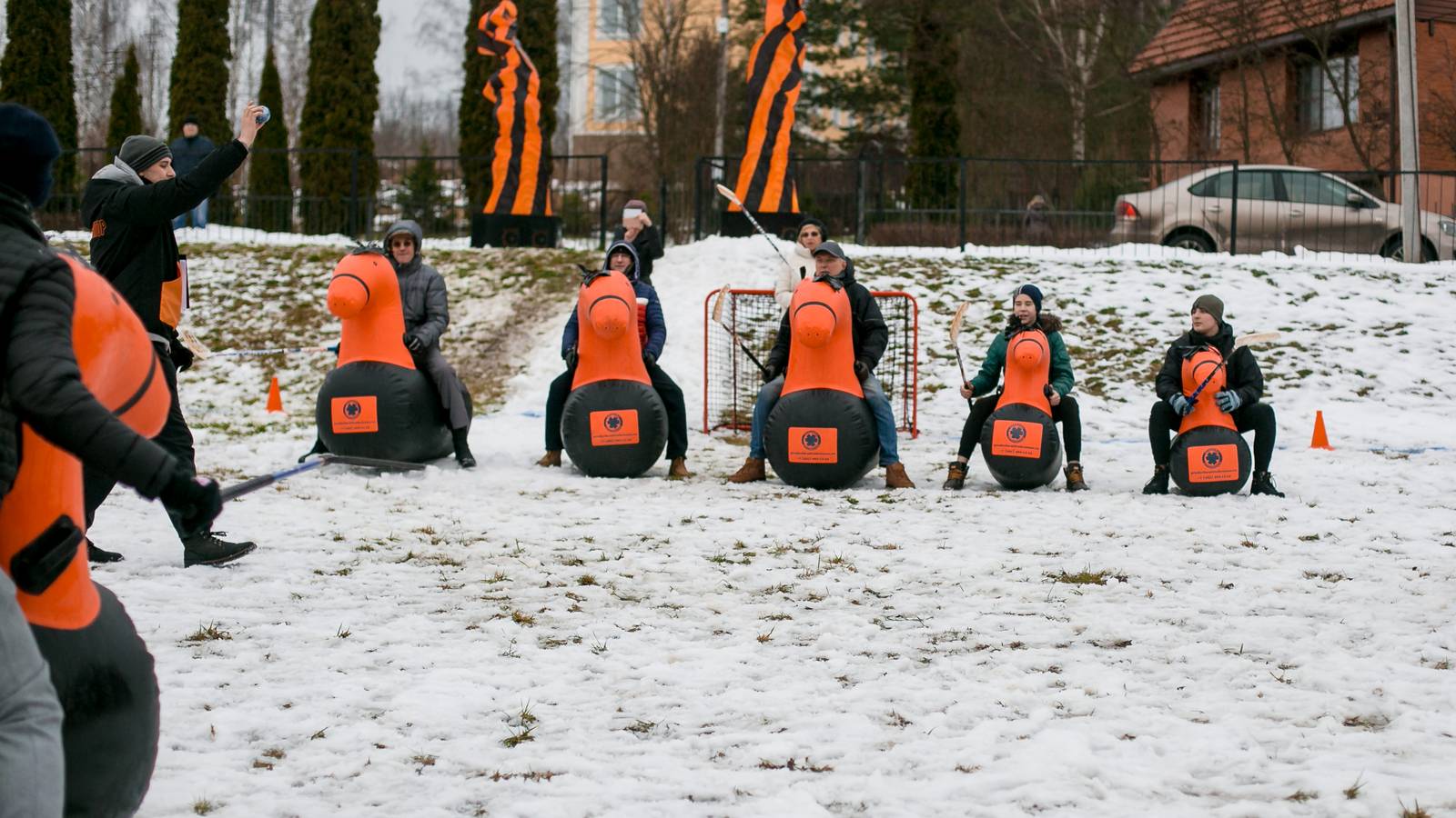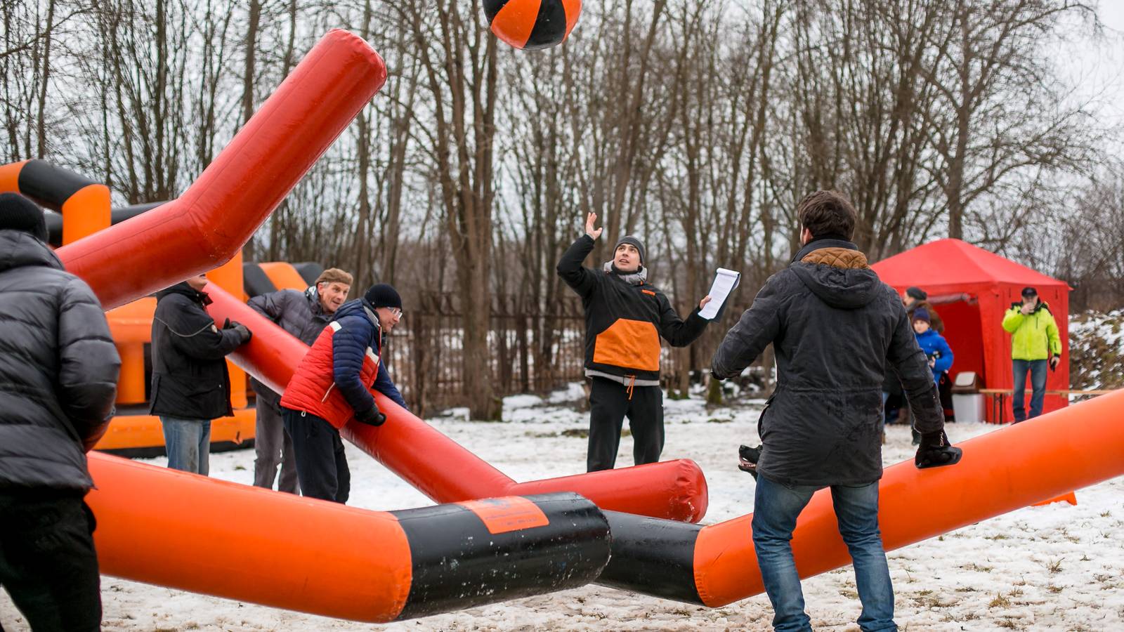 Эффектное патриотичное оформление надувных элементов в цветах георгиевской ленты особенно выигрышно смотрится зимой на фоне белого снега. Атмосферу праздника дополняет аэромен и имитация огня из развевающейся в потоке воздуха черно-оранжевой ленты. Согреться и восполнить затраченные на прохождение испытаний килокалории участники спешили в зоне кейтеринга.